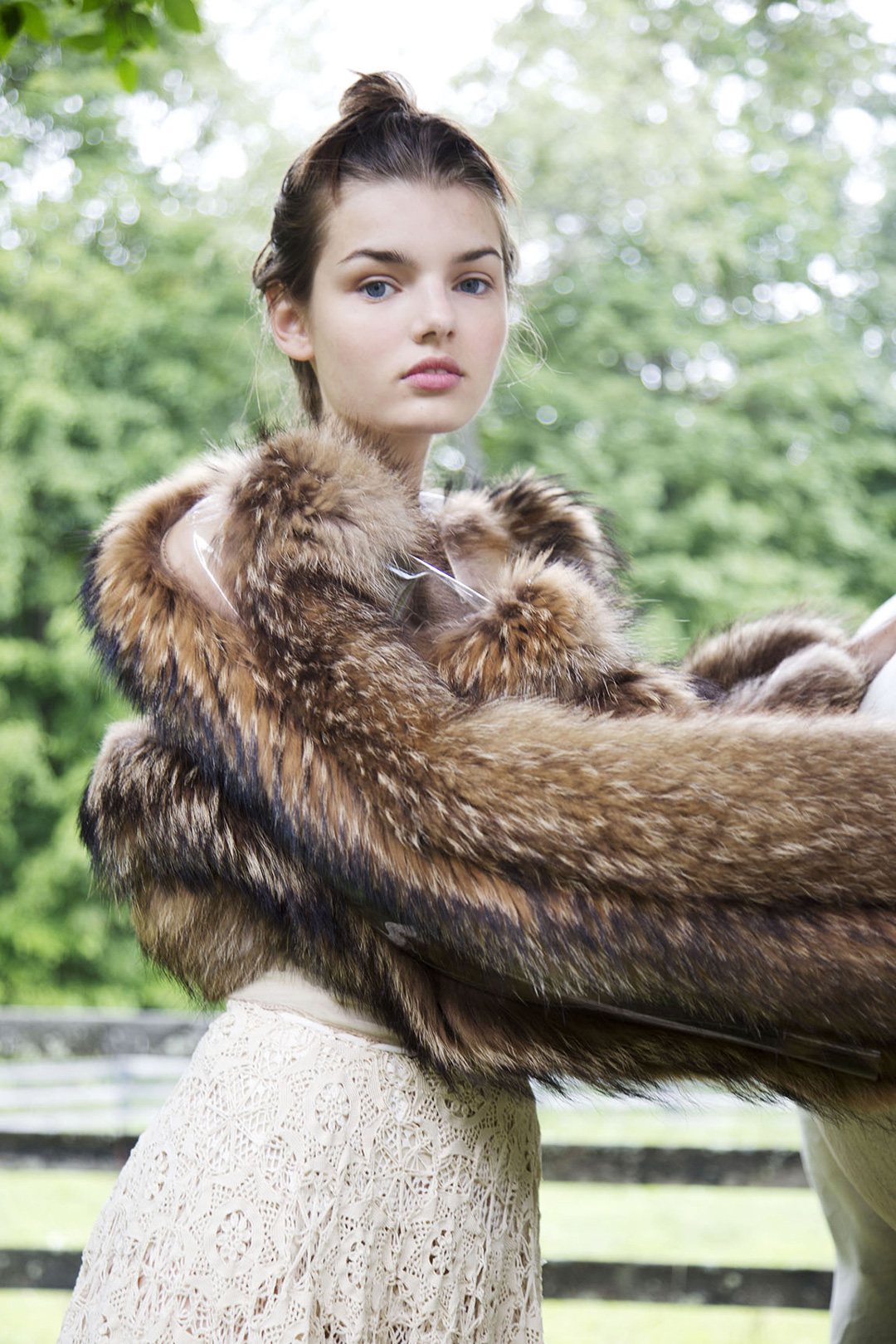 The model is also wearing a double lace skirt. Skirts are repurposed hand made vintage lace. Almost discarded, this treasure of old crocheted materials were a rich and beautiful textile for yet another circular fashion challenge.
